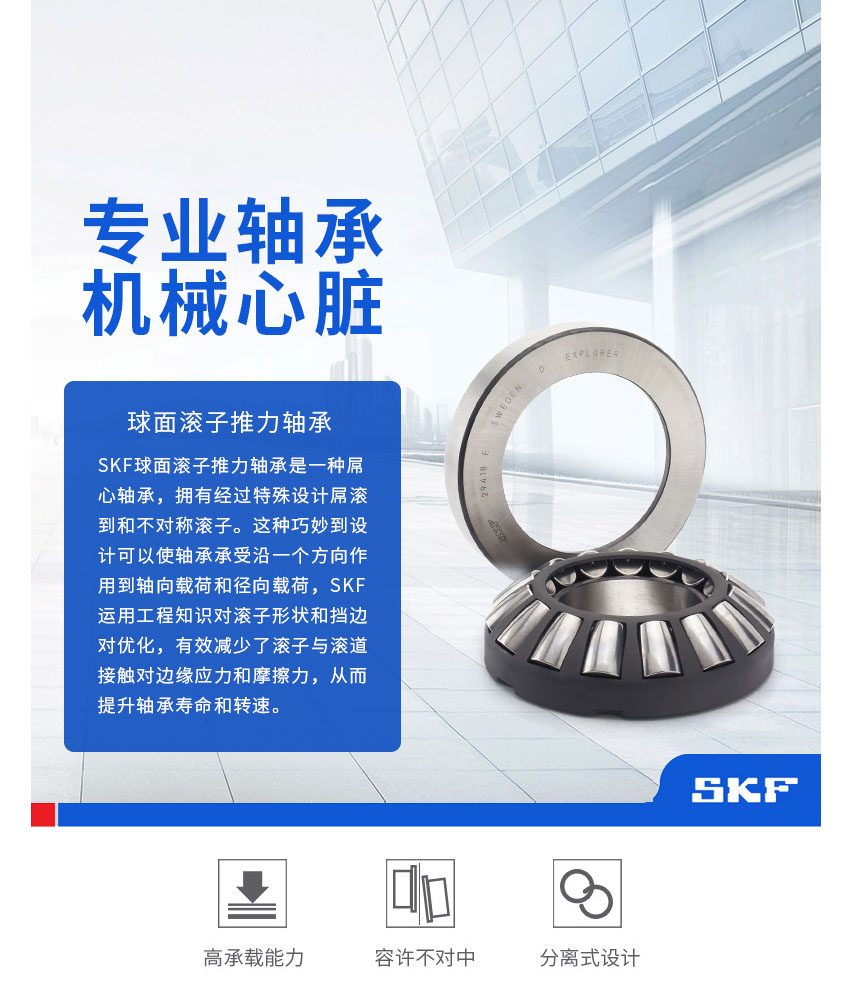 推力滾子軸承是用于承受軸向載荷為主的軸、徑向聯(lián)合載荷,但徑向載荷不得超過(guò)軸向載荷的 55% 。與其他推力滾子軸承相比,此種軸承摩擦因數(shù)較低,轉(zhuǎn)速較高,并具有調(diào)心性能。